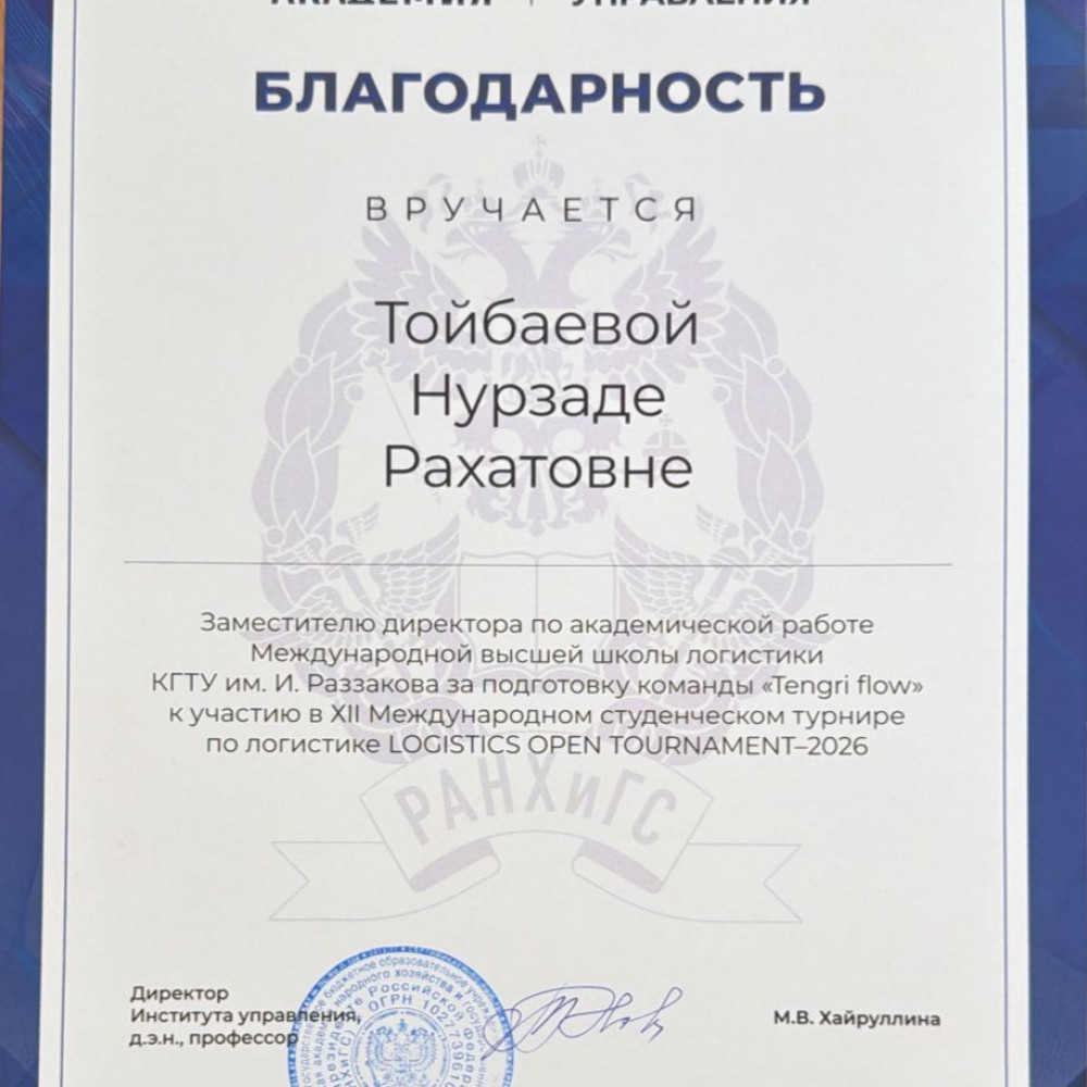 On March 27, 2026, the XII International Student Tournament "LOGISTICS OPEN TOURNAMENT – 2026" was held at the Presidential Academy (RANEPA) in Moscow. The team from the International Higher School of Logistics (IHSLO) of KSTU named after I. Razzakov, led by the Deputy Director for Academic Affairs Nurzada Rakhatovna Toibaeva, won the prestigious 2nd place.